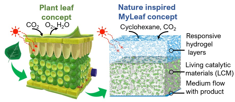 MyLeaf project aims to adopt the nature-based plant leaf concept of self-regulation and sustained maintenance of its photosynthetic machinery. Using the power of genetically engineered phototrophic biofilms stably grown at high cell density within a porous material scaffold and equipped with a stimuli-responsive hydrogel surface layer at the gas-liquid interface will enable a sustained catalytic process for chemical production. The pH or temperature (T) -responsive hydrogel surface layer will respond to the activity state of the microbial consortia within the porous scaffold and allow self-control of its catalytic performance by gas permeation control, similar to the principle of plant leaf surfaces. Thus, the MyLeaf concept will be accomplished based on our expertise in utilizing microbial consortia (e.g. Synechocystis, Pseudomonas) for chemical production, as well as engineering of material scaffolds, including synthesis of pH- and T-responsive hydrogels for developing the self-controlled activity of a living catalytic material (LCM). In the future, our new knowledge should exploit the potential of the microbial MyLeaf concept and allow self-sustained biotechnological processes with a broad application range.